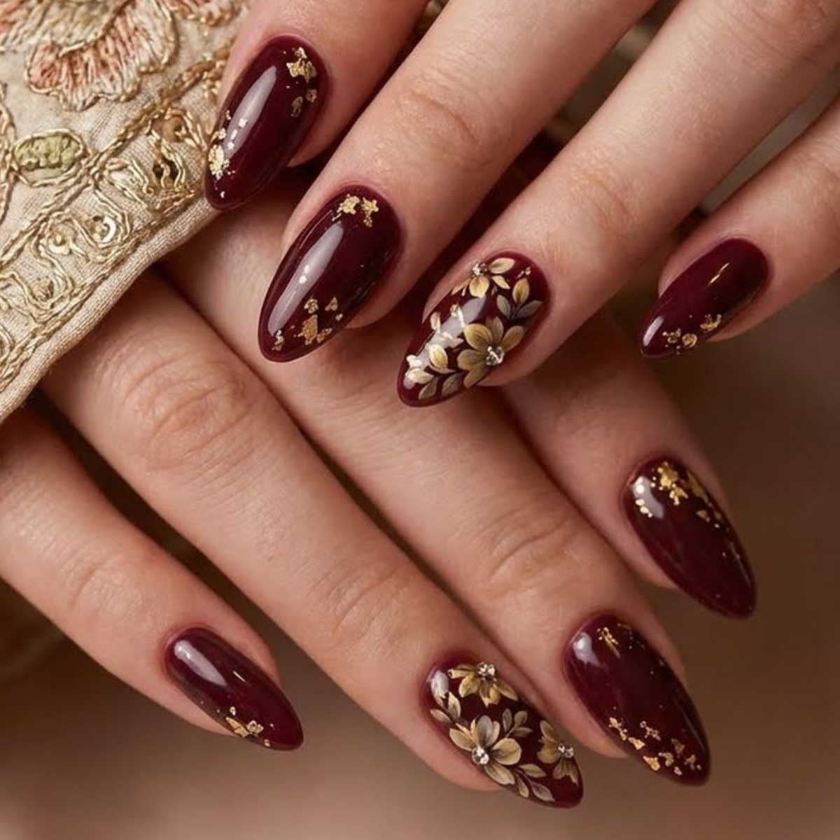 Custom bridal nail art — matching lehenga patterns, couple initials, wedding dates.